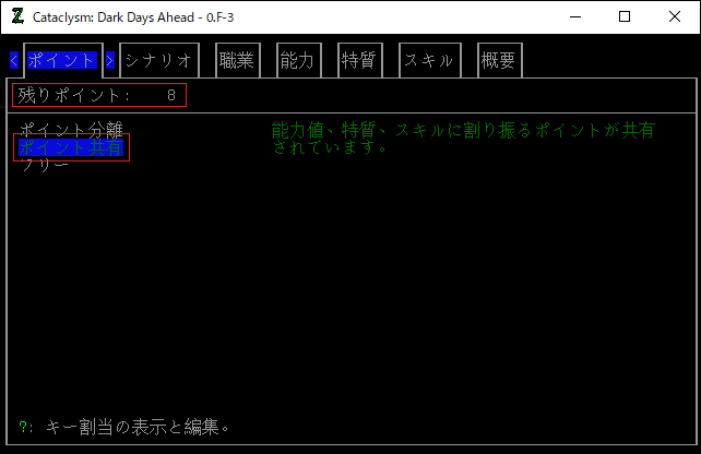 カスタムを実行してMODを読み込みました。上の画像がキャラメイクの設定画面です。いつも通り「ポイント共有」を選択します。「ポイント分離」はポイントの配分が分割されてしまうし、残っているポイントがわかりにくいから苦手だ。「フリー」は最強を追求したい玄人向けだな。