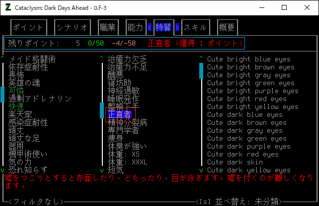 「正直者」の特質はRP的に好きじゃないんだよ。好きじゃないけど取り得だからゲットしますわ。俺はプレイ日記でNPCを騙したりはしませんよ。真面目にミッションに挑戦するからブログ記事になるのだしね。