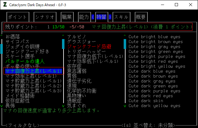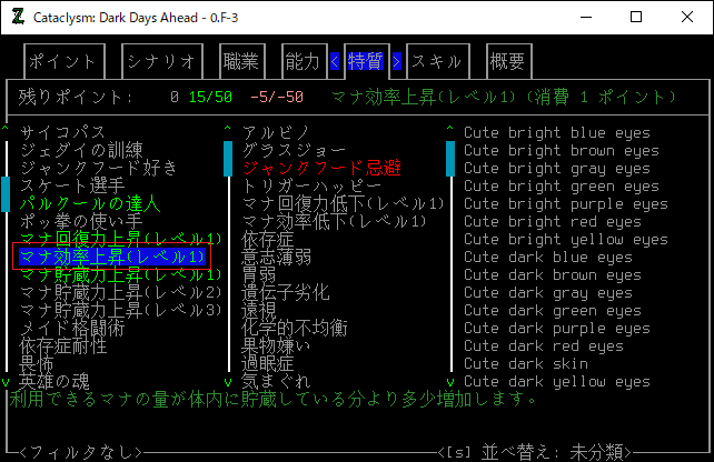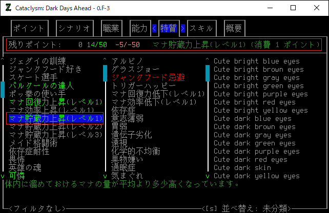 そして次は「マナ貯蔵力上昇(レベル1)」をゲットしました。これでポイントが「0」になりキャラメイクは終了したことになる。しかし、「マナ効率上昇」を取っていないのが気になってしょうがない。俺は神経質だからMagiclysm系の特質は全種類取っておきたいんだよ。