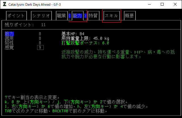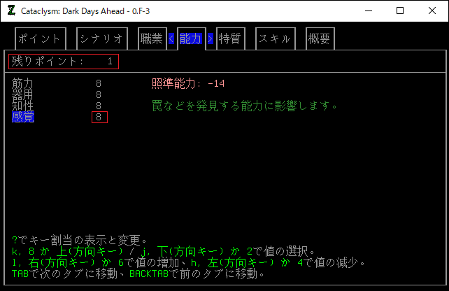 幻視で9に増えていた感覚を「8」に減らしました。過去のバージョンでは感覚が10にならないと罠を発見できなかった(たぶん)。最近は8でも発見できるようだし大丈夫でしょう。