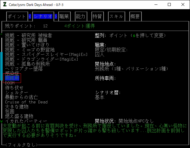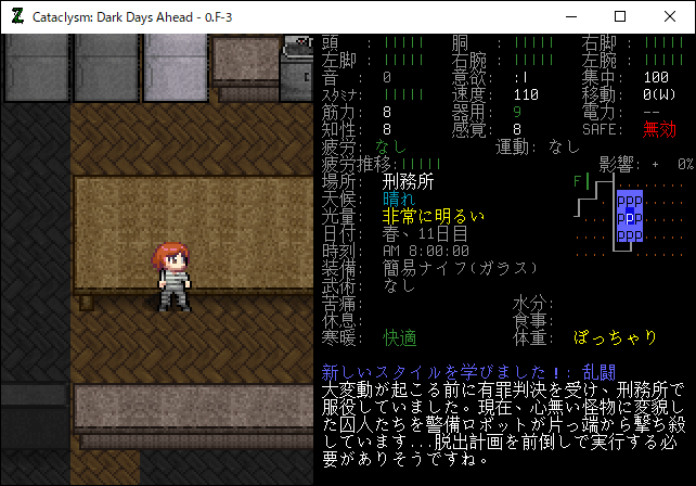 とはいえ、難易度は0.Dのときよりも上がっている。スタート地点の刑務所からしてやり直しが前提の運ゲーだしなあ。まあ難しいカタクリをやるのもよかろう。過去のプレイ日記とは違ったサバイバルを楽しみたいしね。それではゲームを開始します!