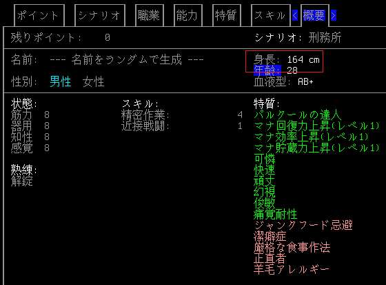 「年齢」と「血液型」は適当に決めました。キャラクターの性別、年齢、身長を設定するとRPがやりにくくなる。個人的に楽しむだけなら問題はないがネットに公開するのはキツい(泣)。だから性別や年齢は非公開にしようかと悩みました。