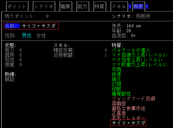 職業を選択したら次は能力の設定になる。いったん能力は保留してスキルから考えよう。能力なんてMODで上がるのだし初期設定でも良いよ。何よりも重要なのは特質だが、シナリオが刑務所なのでスキルも大事だ。