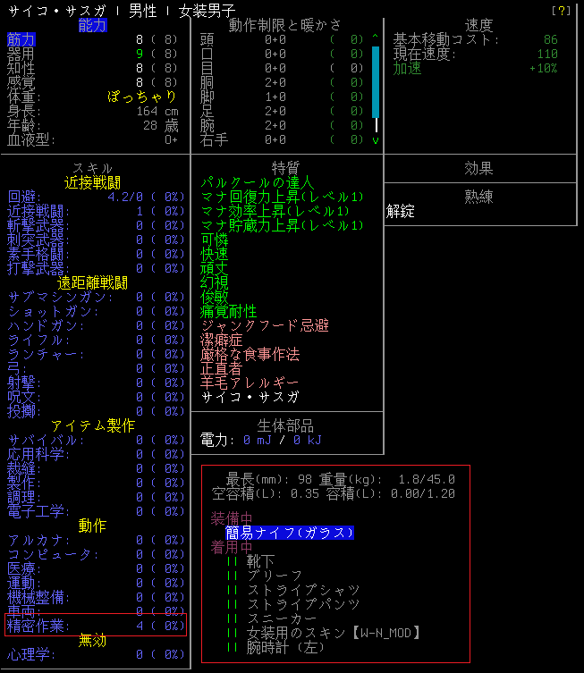 武器と防具が貧弱すぎて不安だ。しかも収納の仕様がまったく理解できない。「空容積(L):0.35」、「容積(L)0.00/1.20」が何を意味しているのかわからねえ。まあいずれ嫌でもわかるようになるだろう。そういえば「乱闘」の武術を覚えたみたいだね。あとスキルを上げたせいか器用が9に上がっています。