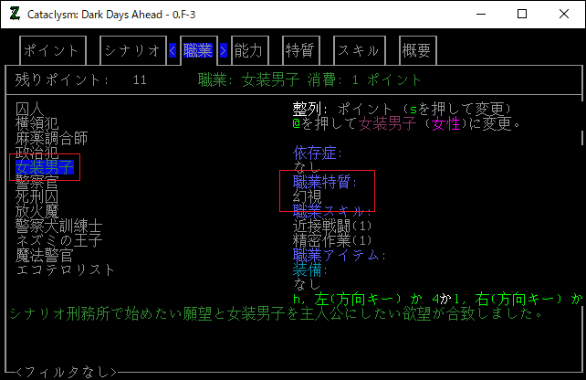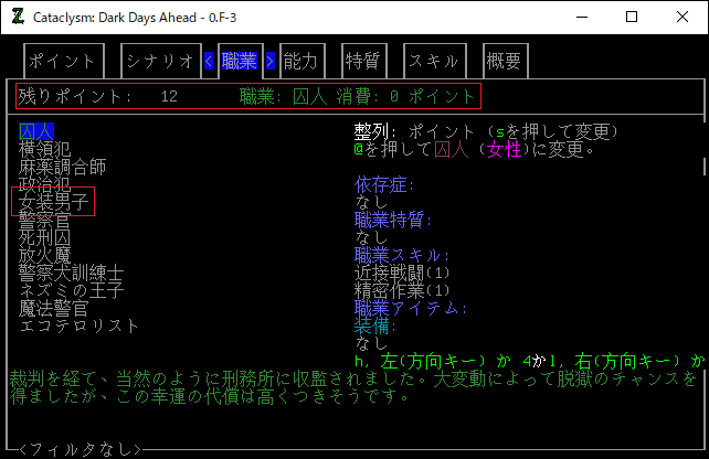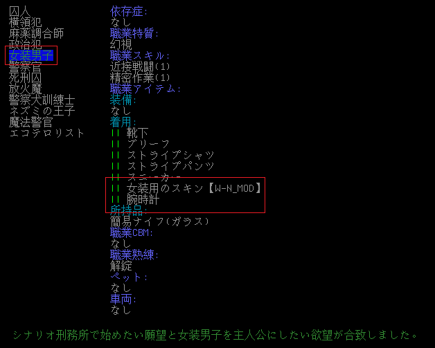 職業は何にしようかなあ。俺好みの「女装男子」があるので、これを選びます。べつに女装男子だから刑務所にぶち込まれたわけではありません。刑務所からスタートしたいという願望とプレイキャラクターを女装男子にしたい欲望が合致したのです。