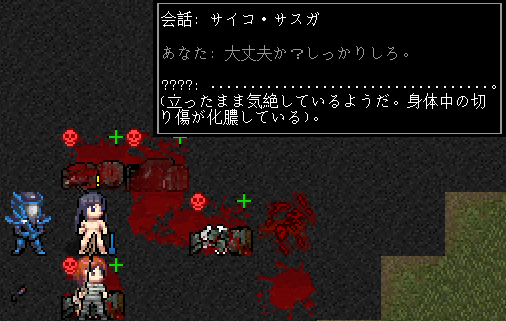 NPCに動けなくなった理由を聞き出します。どうやら彼は立ったまま気絶しているようです。どういう事情かは知らないが身体中に切り傷があり化膿している。こいつは今日中に抗生物質を摂取しないと死んでしまうぞ。