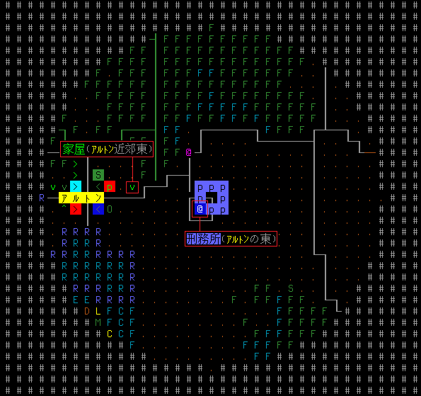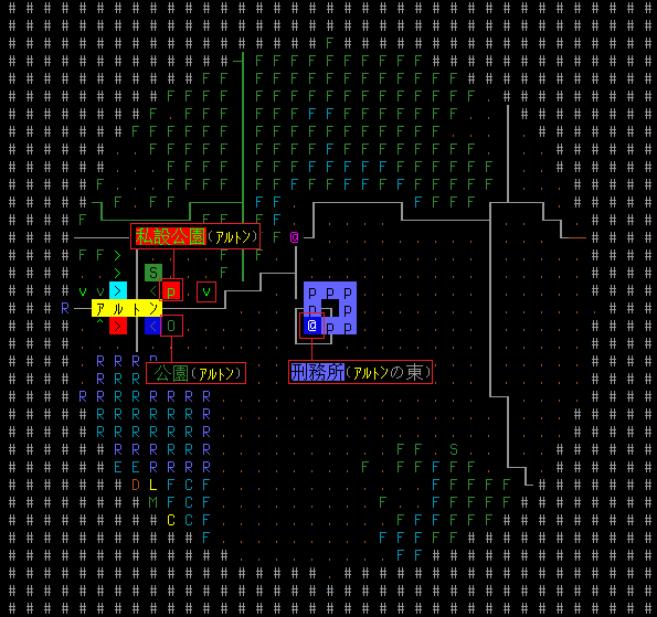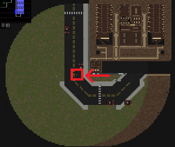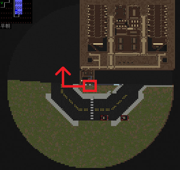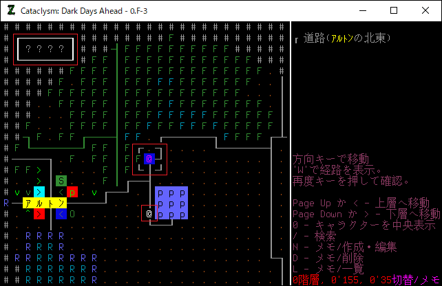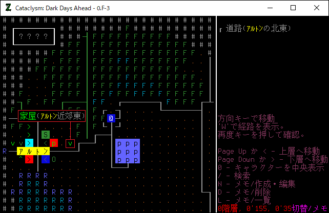 Cataclysm:DDAのプレイ日記を始めます。無事に刑務所を脱獄しました。必勝の戦法とは言えない運ゲーだったが脱獄は脱獄だ。今回は全体マップで周辺の施設を確認してみましょう。楽に攻略できそうな建造物があれば速攻で制圧するぞ。