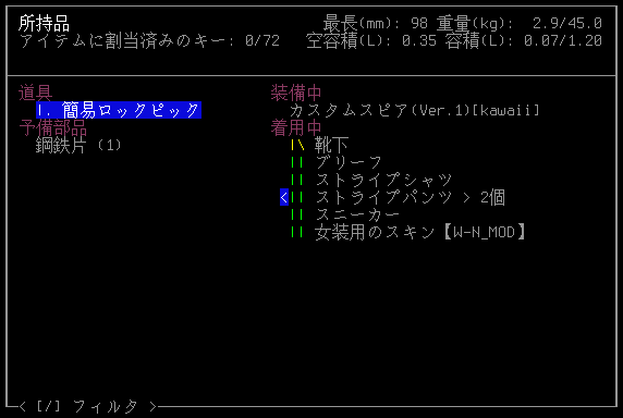 今回の投稿はここで終わりにします。現在の所持品は上の画像。今回はNPCと出会っただけなので何も変わっていません。