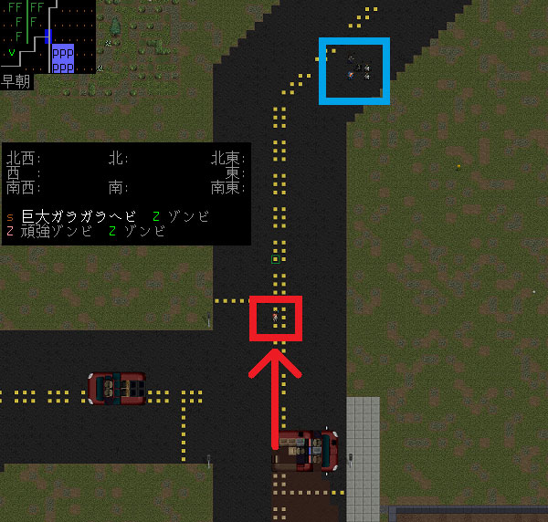 現在の戦場は上の画像。赤い四角が僕の位置です。青い四角の場所でNPCが4体のゾンビと戦っている。巨大ガラガラヘビは遠く西の場所にいるので無視してよろしいだろう。