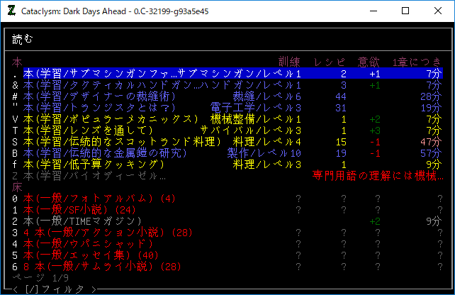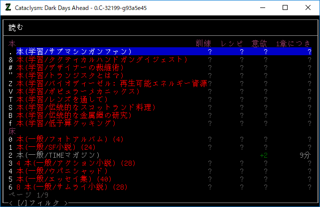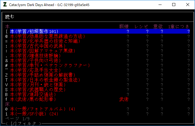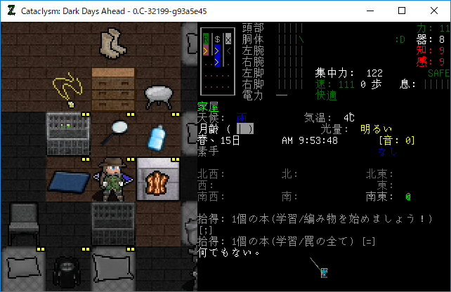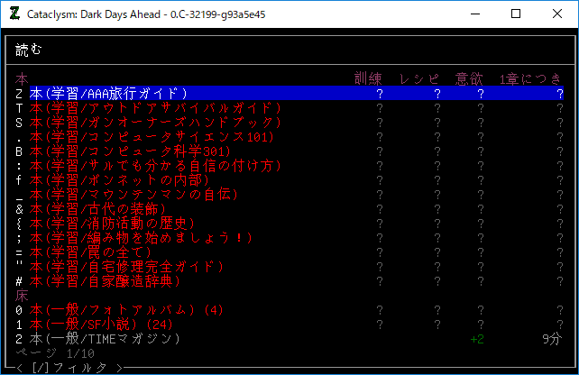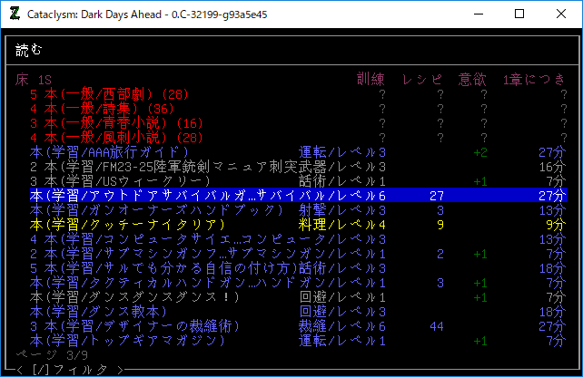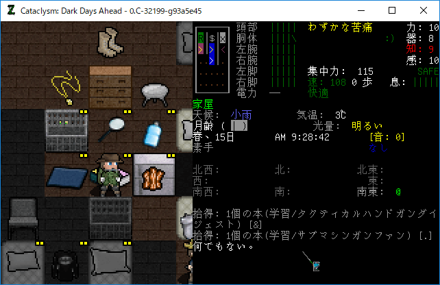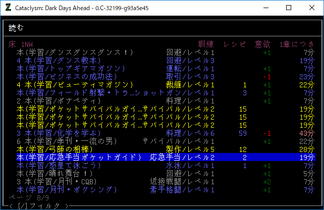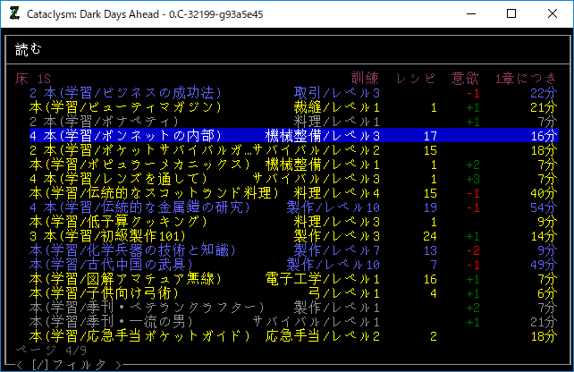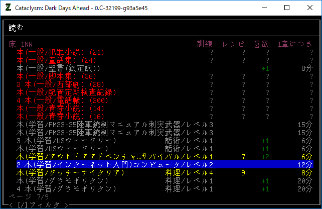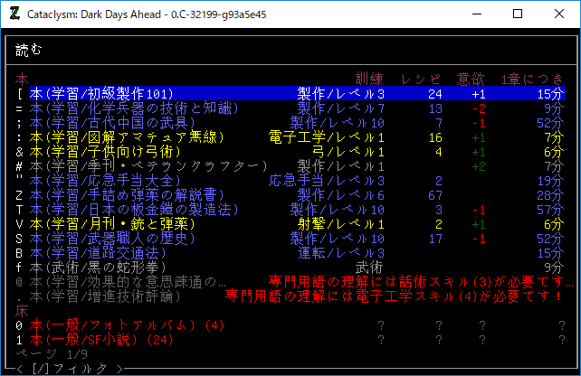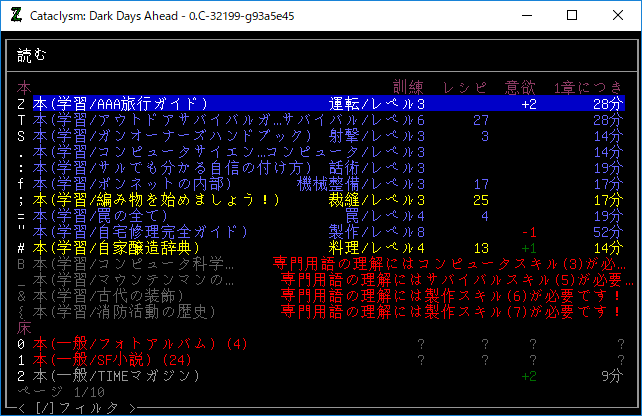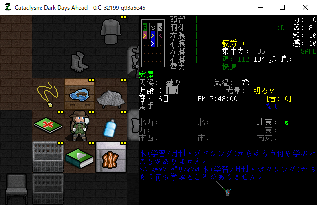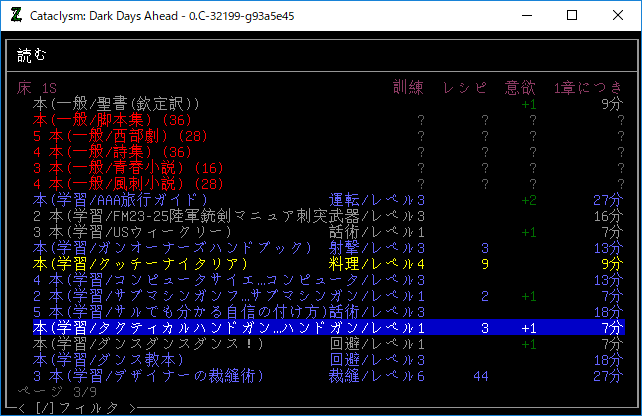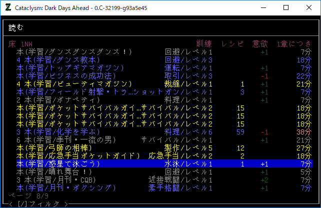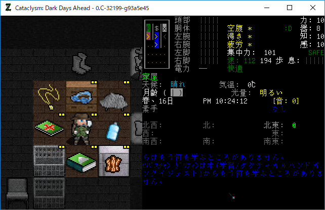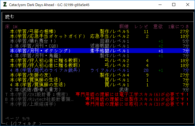 Cataclysmのプレイ日記を始めます。前回は書店へ行って本を回収してきました。現在のアレキサンダーでは車両や銃器を扱うことができません。今日から本を読みまくってスキルを上げます。