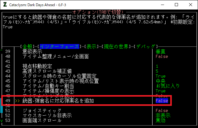 次は前回の投稿で説明し忘れた変更を書きます。インターフェースの「銃器・弾薬名に対応弾薬名を追加」を「False」にしておきました。Falseにしないと銃器の名前が長すぎて画像のサイズが大きくなるからです。