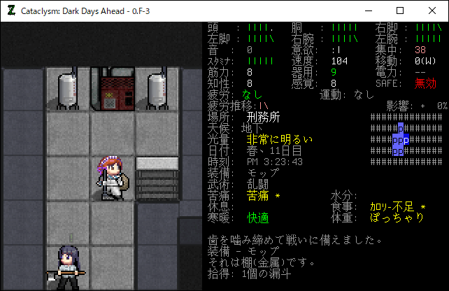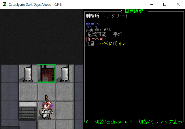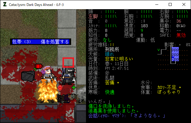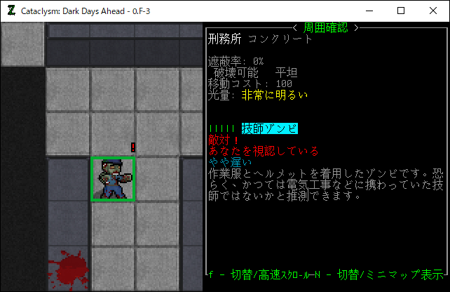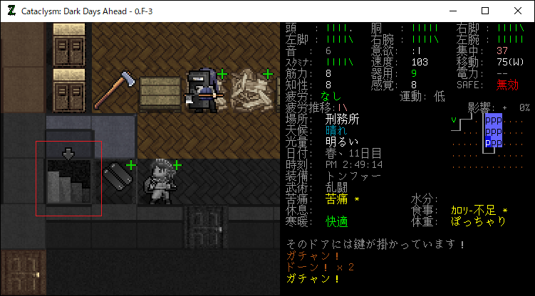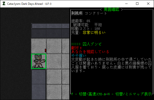 現在地はアルトンの東にある刑務所だ。前回の感染症に悩みながら攻略していくプレイはスリルがあって楽しかった。Cataclysm:DDAは本当に面白い。世界中の天才が集まって作っているゲームだから世界一面白いと言っても許されるだろう。