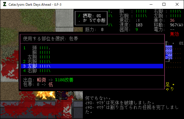 包帯を使用すると上の画面が表示されます。左脚の部位に出血「軽微」と書かれています。この左脚の位置でEnterを押すと止血することができるのかな。
