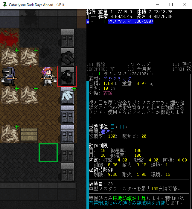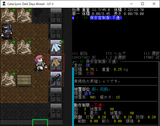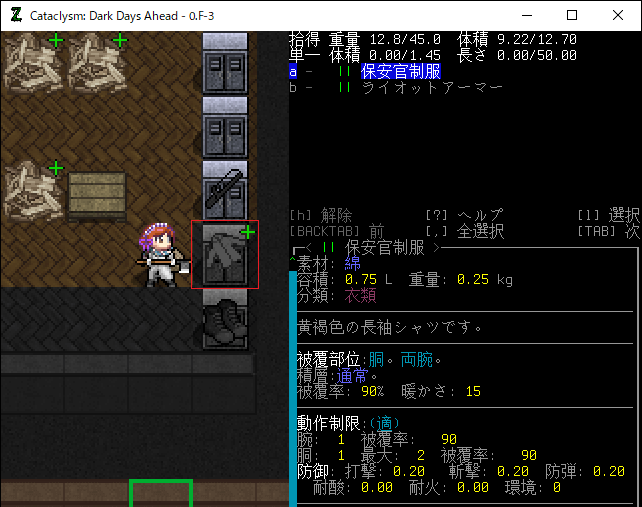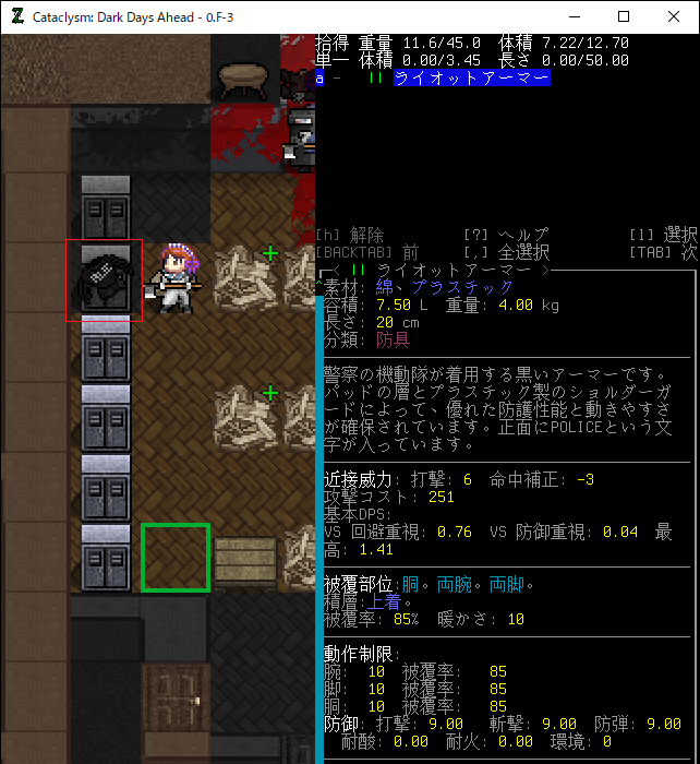 Cataclysm:DDAのプレイ日記を始めます。警官ゾンビのドロップアイテムから消毒薬を入手することができました。一時は死ぬことも覚悟したけど無事に感染症から解放されたよ。今回の投稿は制圧した部屋のロッカーから戦利品をウマウマとゲットします。