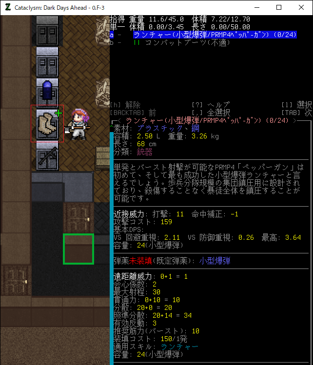 ロッカーに「ランチャー」と「コンバットブーツ」が収納されている。ちくしょうコンバットブーツが不適でなければ装備したのになあ。ランチャーは「威力+1」のゴミなので使用しないと思う。いやそんなこともないか。最大射程が30なのは優秀ですね。