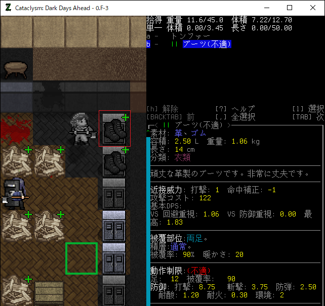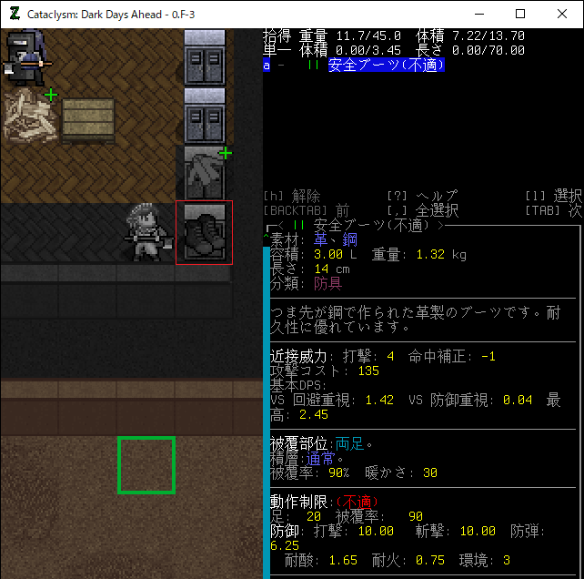 このロッカーにある「ブーツ」はヤマダくんに装備させようかな。個人的にブーツのタイルは気に入っているのです。不適だから動作制限が12と高いけどヤマダくんは走り回るタイプのサバイバーではないからね。