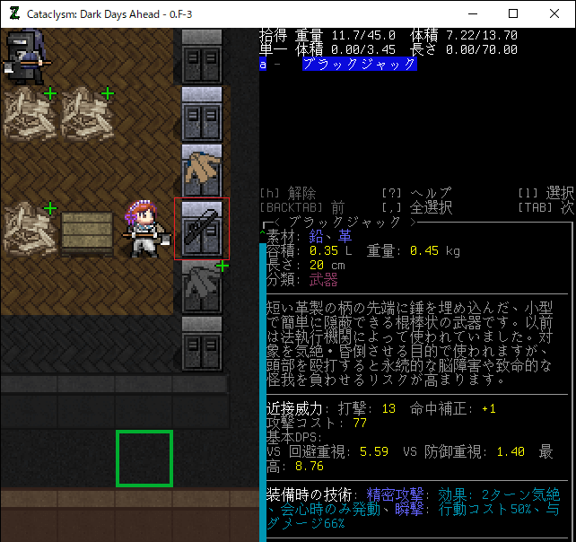 「ブラックジャック」は打撃13の鈍器です。それなりに打撃の値があって容積が0.35Lと低い。つまり携帯性に優れている鈍器だから家具をぶっ壊すのに最適なのだ。まあ武器としては役に立たないので、家具を壊している最中に襲撃されたら大ピンチになる。それでもブラックジャックは持ち歩きます。