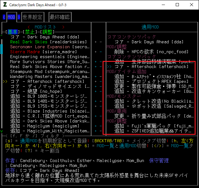 というわけで既存の世界にAftershockを導入します。こっそりとAftershock以外のMODも導入してしている(笑)。まあレシピ系のMODばかり選んだからエラーは発生せずに成功するだろう。0.F-3安定版の長所は3回もブラッシュアップをした「安定」なんだからいけるって!