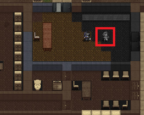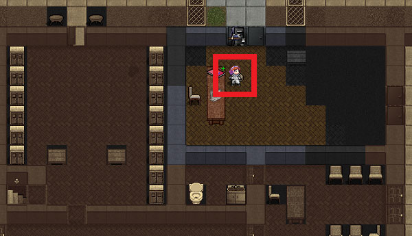 ピッキングをして右上の部屋に入りました。この部屋に配置されているのはカウンターと椅子だけだ。もしもベッドがあればここに物資を集めて拠点にしたのになあ。