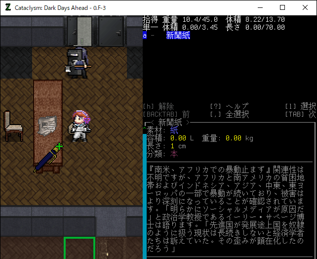 Cataclysm:DDAの「新聞紙」は綿密に作り込まれている。デバッグメニューで新聞紙を出して読むだけでも楽しめます。新聞紙は大変動の直前に発行されたので記事の内容は切迫したものが多い。