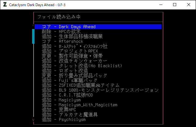 とくにエラーは出ずにAftershockの導入が成功しました。影響力のあるMODを入れてしまったけど刑務所の中は変化しない。基本的に既出のものは地形だろうとアイテムだろうと変わりません。すでに刑務所の情報はセーブデータに記録されているからだ。ただしAftershockがアイテムやモンスターの性能を上書きしたら変わってしまう。W-N_MODはゲームをプレイしながらアイテムを追加したり、タイルや性能を上書きしています。それと同じことが起きた可能性はある。