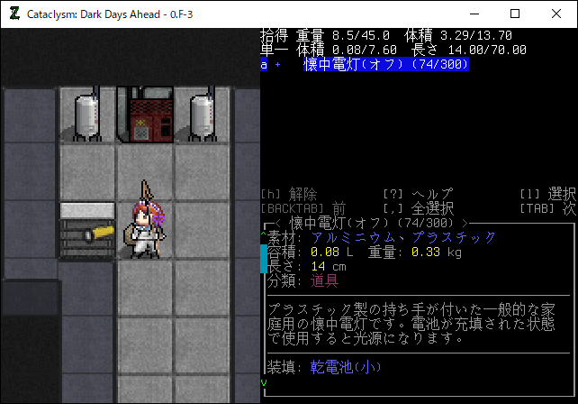通路の行き止まりで懐中電灯を拾いました。容積が「0.08L」と小さいので持ち歩いてもかさばりません。0.F-3はアイテムの持ち運びがシビアになったので小さいアイテムが嬉しい。