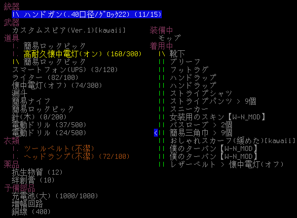 現在の所持品と装備品は上の画像。包帯を携帯していないのはダメでしょう。簡易包帯でも良いから出血したときのために何枚か所持しておくべきだ。