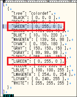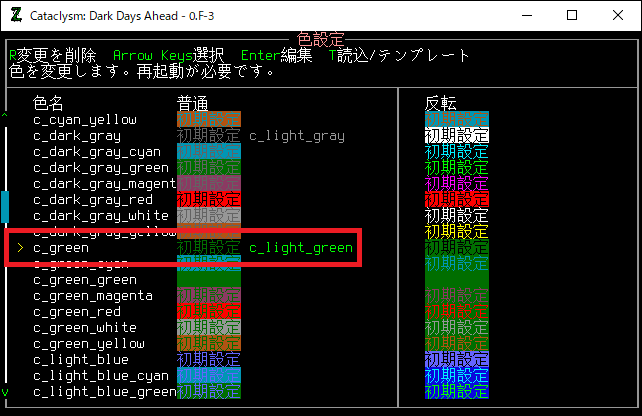 オプションで文字色を変更すると何かとエラーが起きやすい。エラーは嫌なので「base_colors.json」の「GREEN」の値を「LGREEN」と同じ[ 0 , 255 , 0 ]に変更しました。これなら変なエラーが出ることなく緑色の文字が明るくなります。