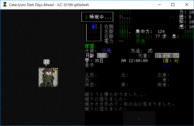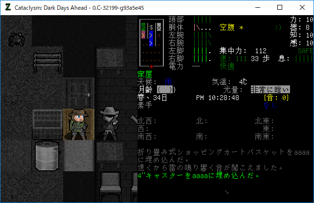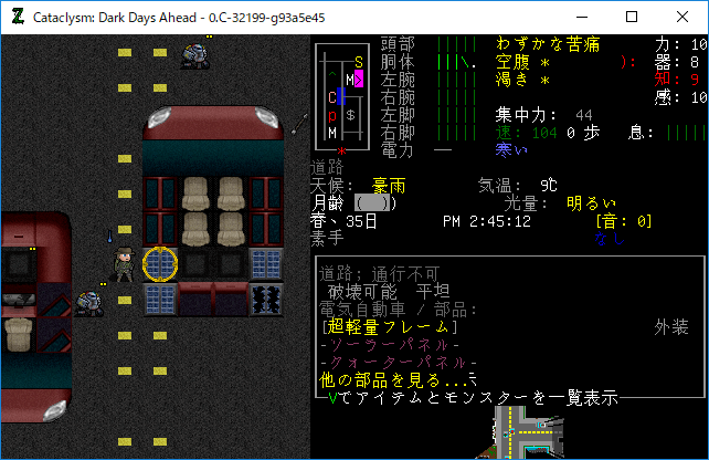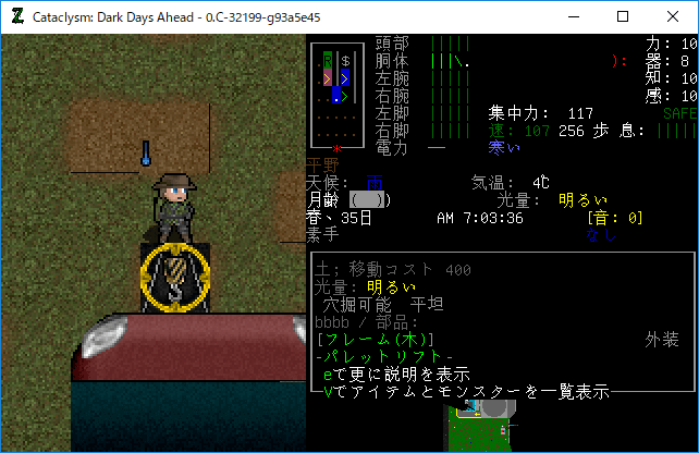Cataclysmのプレイ日記を始めます。前回は戦闘の準備を怠って殺されそうになりました。胴体部分の動作制限が高すぎるんだよな。今回は装備を変えて動作制限を下げます。