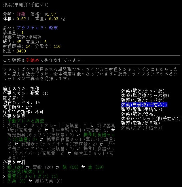 ショットガンに装填する散弾はいくつか種類があります。自分がクラフトしたのは単発弾ですね。ラッパ銃の弾は装填できないと考えた(試してはいない)。