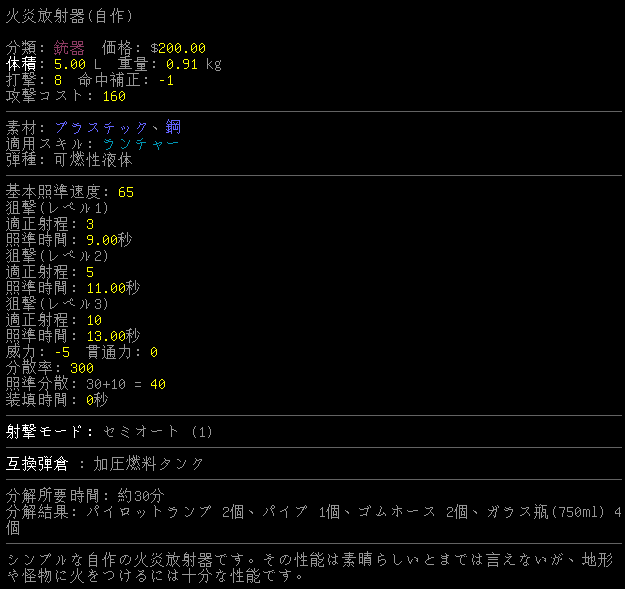 火炎放射器も製作可能です。見るからに性能が低そうだよなあ。化学物質噴霧器のレシピはありません。真菌治療薬も作れない。