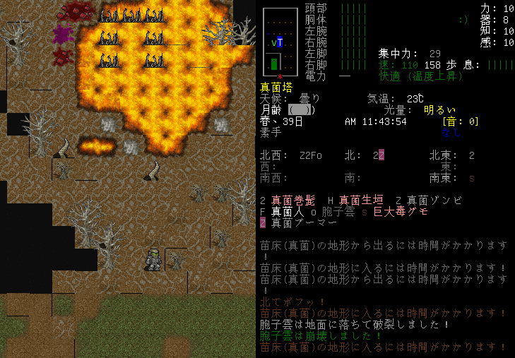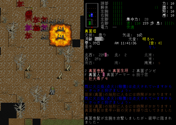 Cataclysmのプレイ日記を始めます。拠点の近くに生成された真菌塔へやってきました。周囲は敵だらけなのに汚染された大地から真菌巻髭が生えてきます!どうすれば真菌を殲滅できるというのだ。