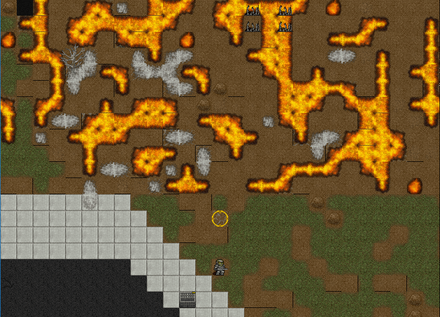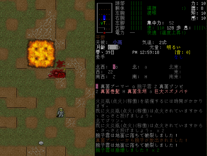 真菌塔の死体にめがけて火炎瓶を投げるぞ。どうやら3×3の範囲しか効果はないようです。おいおい!そんなお嬢ちゃんみたいな火力じゃあ何本投げても足りねえだろうが!