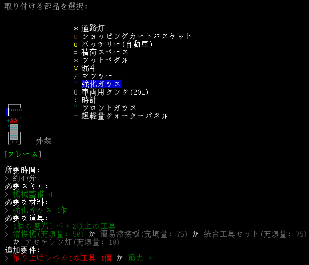 いつの間にか強化ガラスを回収していたのか。ただのフロントガラスよりも戦闘向きっぽいから取り付けてみることにする。