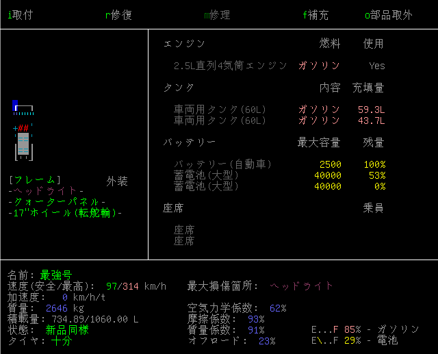 アイテムを積みすぎて加速度が0km/hになっておる。6気筒エンジンへの変更を検討しなければいけないね。ちょっと運転をしただけなのにヘッドライトが壊れる寸前だよ。こんな有り様では遠征なんて無理だよなあ。