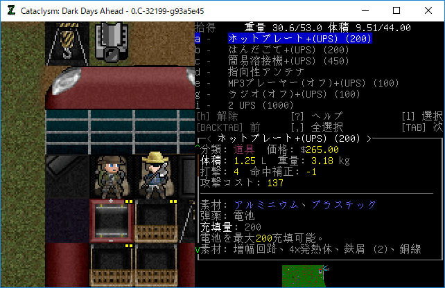 Cataclysmのプレイ日記を始めます。UPS互換充電ステーションを取り付けて電池が使い放題になりました。電化製品が使い放題になればもう炭はいらないかな?今回も便利な電子機器をクラフトします!