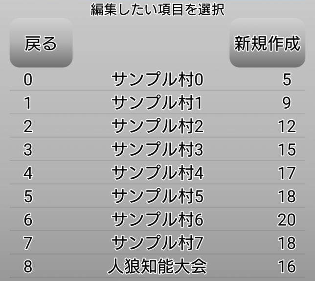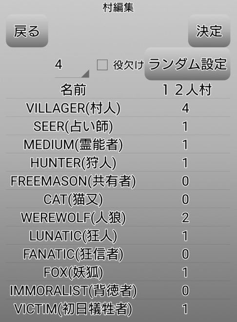 村の人数や役職の数を自由に設定できます。