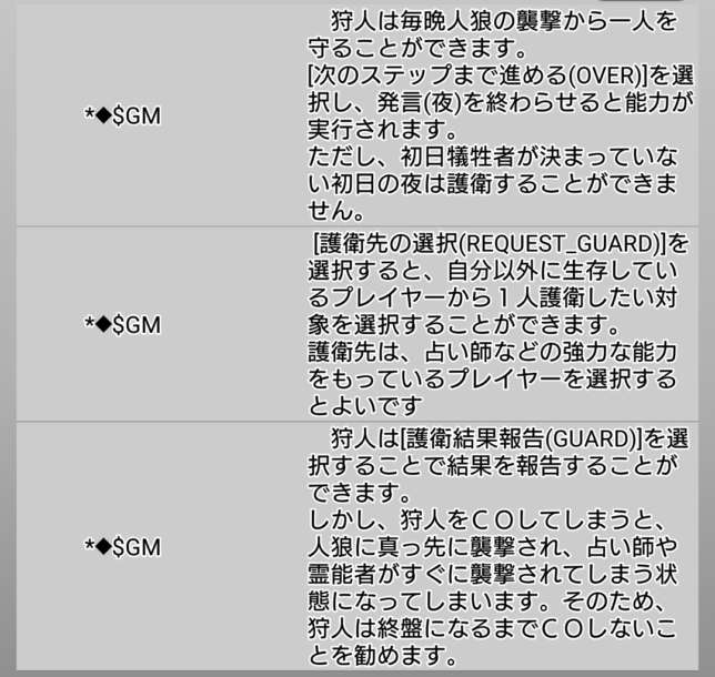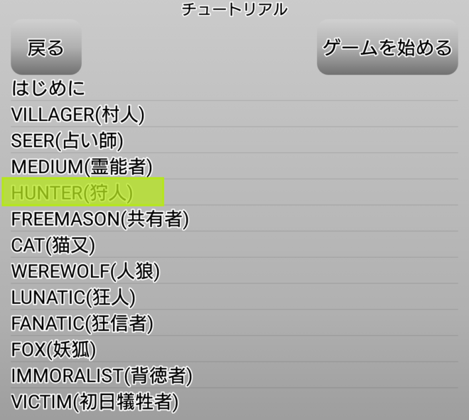 上のような画像が表示されて『狩人』を学ぶことができます。画像を見ると多くの役職が用意されているのが分かりますね。私は初心者なので遊んだことのない役職があります(笑)。AI達と対戦しながら勉強をしたいと思います!