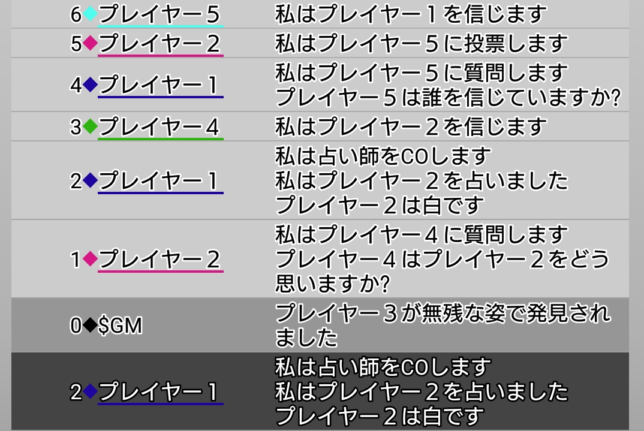 赤くなっている『プレイヤー3』は初日犠牲者です。この状態でゲームを始めると下図のようにプレイヤー同士の議論が開始されます。