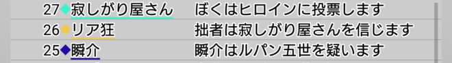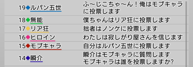 ルパンとリア狂が共謀してノンケを吊ろうとしているように見える。ルパンは投票先の質問に誰と答えるかね。
