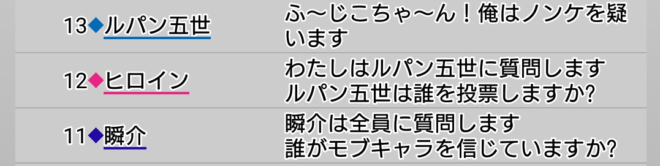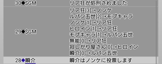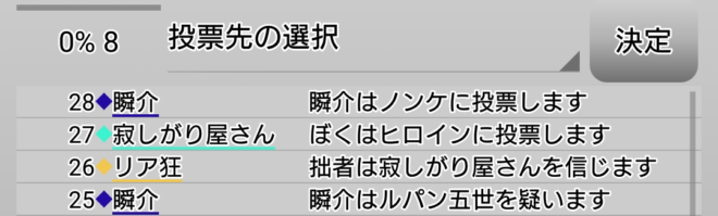 瞬介「失敗した。占い師を信頼しているかではなく疑っているのか聞けば良かった(泣)。ん?ヒロインがルパンへ投票先の質問をしたようだ。そしてルパンはノンケ疑い。おかしなことが起こってきた」