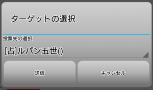 真霊能の俺を信じているか聞いてみようか。いや、信じると答えるに決まってる(笑)。もう俺が騙りの占い師を見極めて吊るしかない!行動はあと3回しかできないよな。投票宣言をして他のプレイヤーからの同調を期待するか?う、うう・・・・時間がないので直感だ。リア狂との共謀を臭わせるルパンに投票宣言だ!