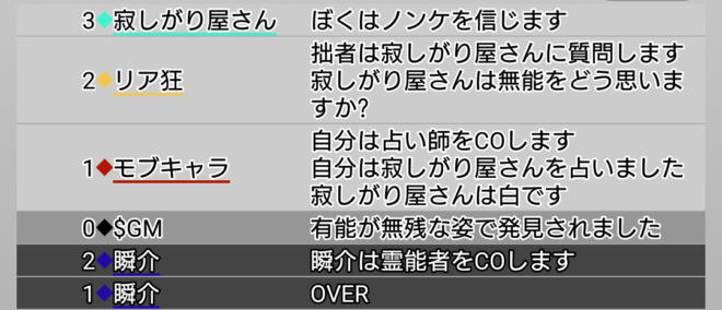 瞬介「リア狂は協調性が高かったはずだ。なぜこんなにも我が道を突っ走る。3票集めれば吊れるはずだ。現在、どちらの占い師の方を信じられる?」