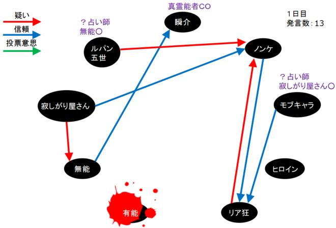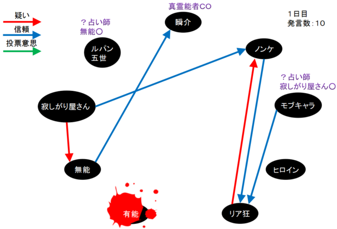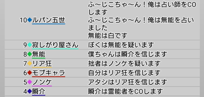 瞬介「初日犠牲者は有能だ(上の図)。味方になれば心強かったし人狼でも立ち回りを学べると思っていたんだが(笑)。まあ面白いゲームになりそうだから頑張ろう!」