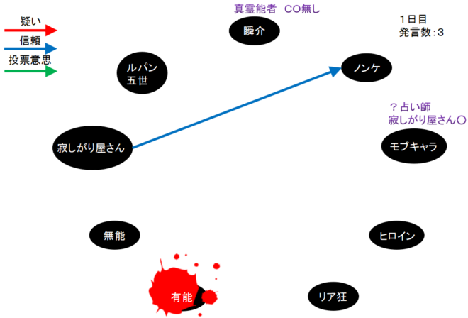 現状、自分が考えている事はヒロインの発言が無いのが不自然なこと、前回人間不信のようだった無能が信頼発言を飛ばしており違和感があること、そして占い2人のうちどちらかを吊ってほしいと切に願っているということだ(『未来の僕より。グレー吊りをしましょう』)。
