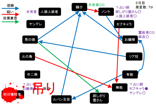 瞬介「共有者でも●吊りをとめられる力はないようだ。まずいな。ノンケや無能から交互に●を出されて吊り回数を消費させられてしまう。寂しがり屋さん(妖狐)には○があるので吊れる機会があるのかどうかもわからーん!」