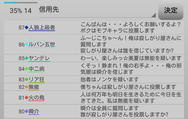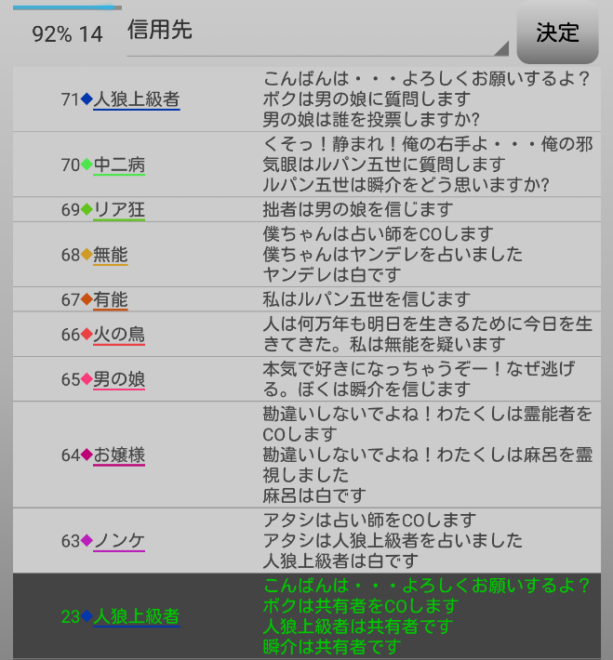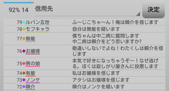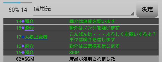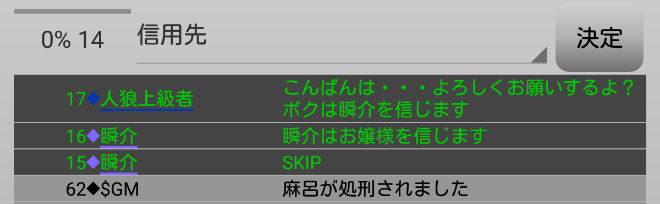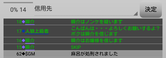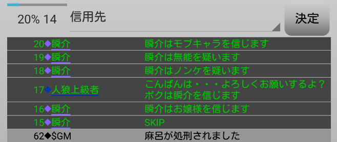 瞬介「とりあえず俺からは真霊能者のお嬢様を信頼しているとメッセージを送ってみた(上の図)。人狼上級者さんは俺を信頼してくれているようだ。なんだかホ○ホ○していて照れくさいな」