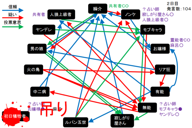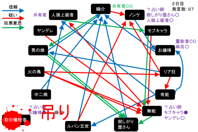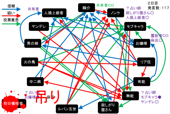 ノンケが人狼上級者さんを占って○を出している。これにより人外が潜伏共有者に●を出して破綻する計画は潰えてしまい、○持ちの人狼上級者さんは人狼の噛み先候補となったのかな。潜伏している役職者を噛むためにグレー噛みを選択する可能性もあるけど。