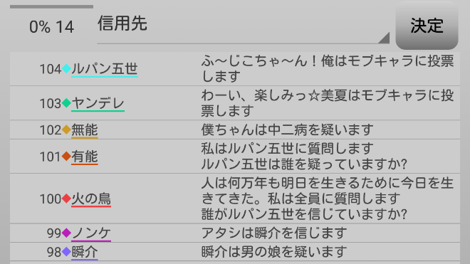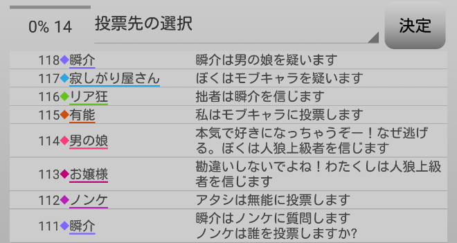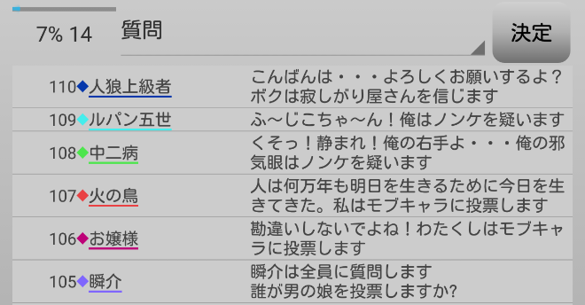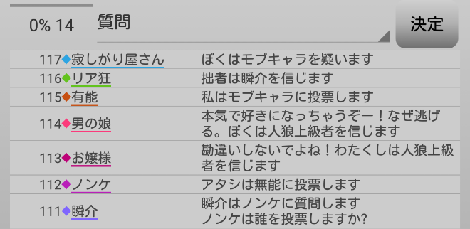 こうなればモブキャラ吊りから占い師無能に破綻してもらうしかない。真霊能者お嬢様噛みをされないよう、人狼男の娘へ疑い発言を飛ばしまりたい。だが次は6回目の発言となり質問をできる最後のターンとなっている。ノンケの投票先を聞いて背徳者なのか人狼なのか見極めてしまおう。『ノンケは誰に投票をしますか?』」