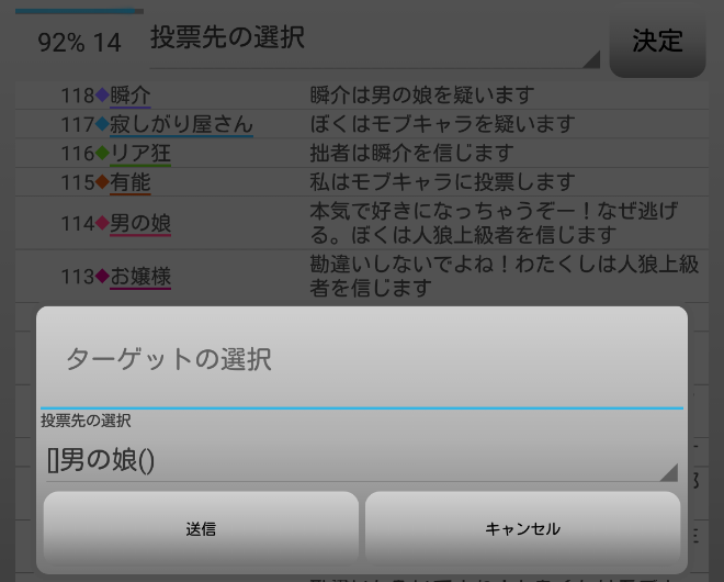 人狼上級者さんがモブキャラ(無能の●)へ投票宣言をしている。今日は●吊りを避けられないか?今からでもグレランの流れにして男の娘を吊れないだろうか?3日目に男の娘○の占い結果を出されたらやっかいなことになるね。俺は『男の娘に投票します!』」